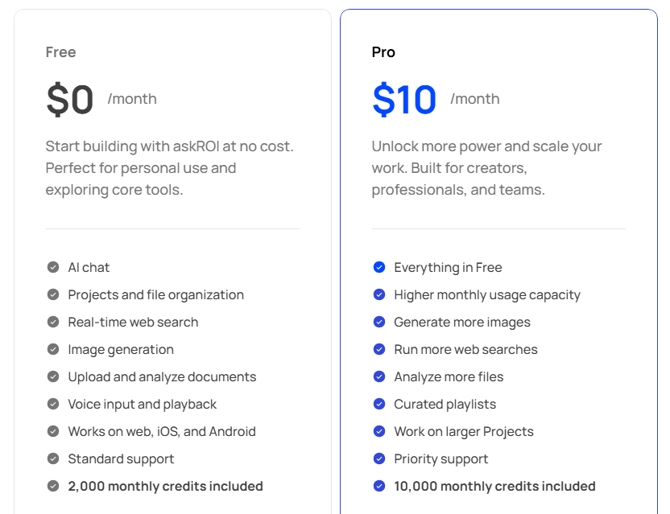 What is included in each plan? Feature comparison. Questions? If you have any Sales questions, please email us at: sales@askROI.com or call us at: 877-427-5764.